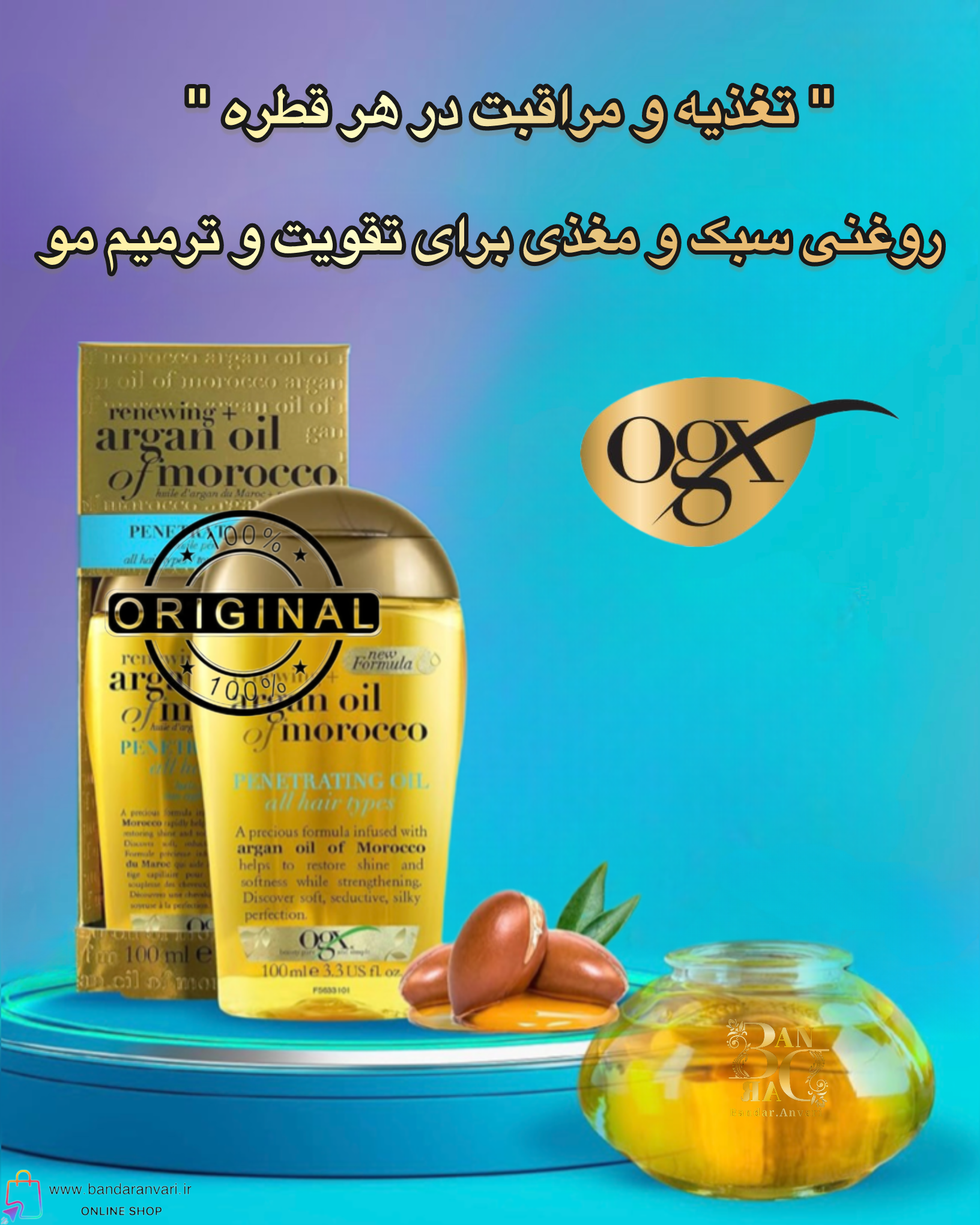 روغن آرگان مراکشی OGX ترمیمکننده و براقکننده مو – مناسب انواع مو Renewing + Argan Oil of Morocco Penetrating Oil OGX– For All Hair Types