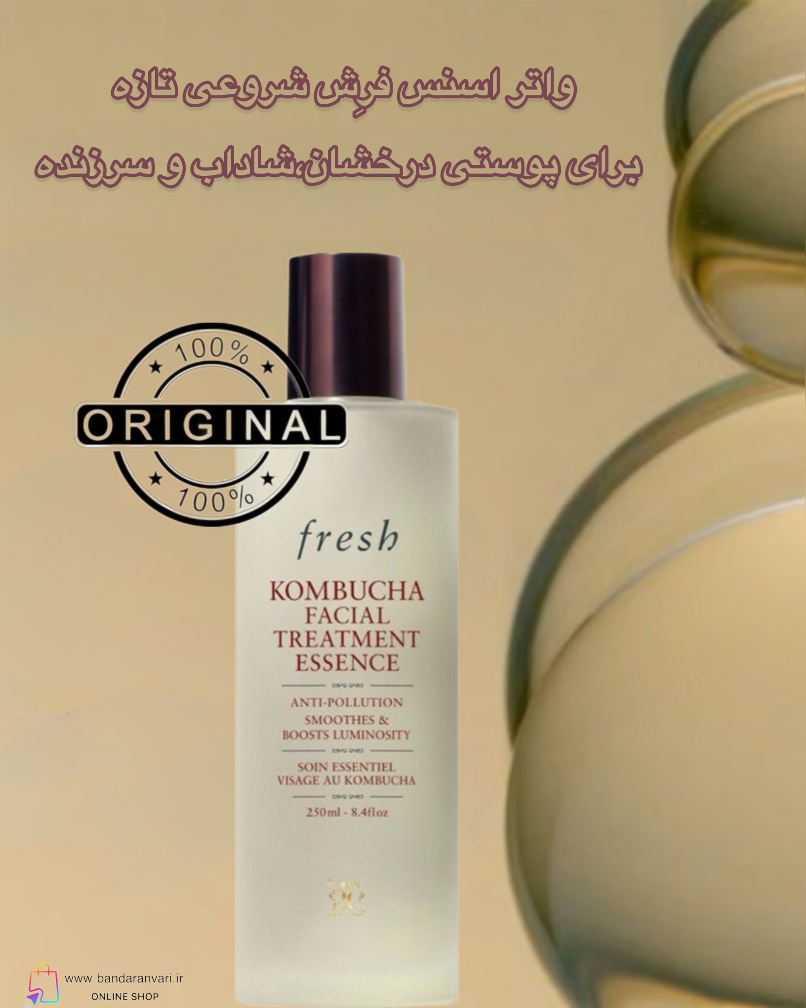 واتر اسنس صورت فرش با کامبوچا 250 میل – ضد آلودگی و شفافکننده پوست Fresh Kombucha Facial Treatment Essence – Anti-Pollution, Smoothes & Boosts Luminosity