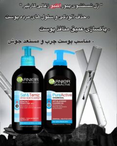 ژل شستوشوی زغال گارنیر پیور اکتیو، پاککننده عمقی منافذ و کاهشدهنده جوشهای سرسیاه، مناسب پوست چرب و مستعد آکنه، حاوی زغال فعال و اسید سالیسیلیک.