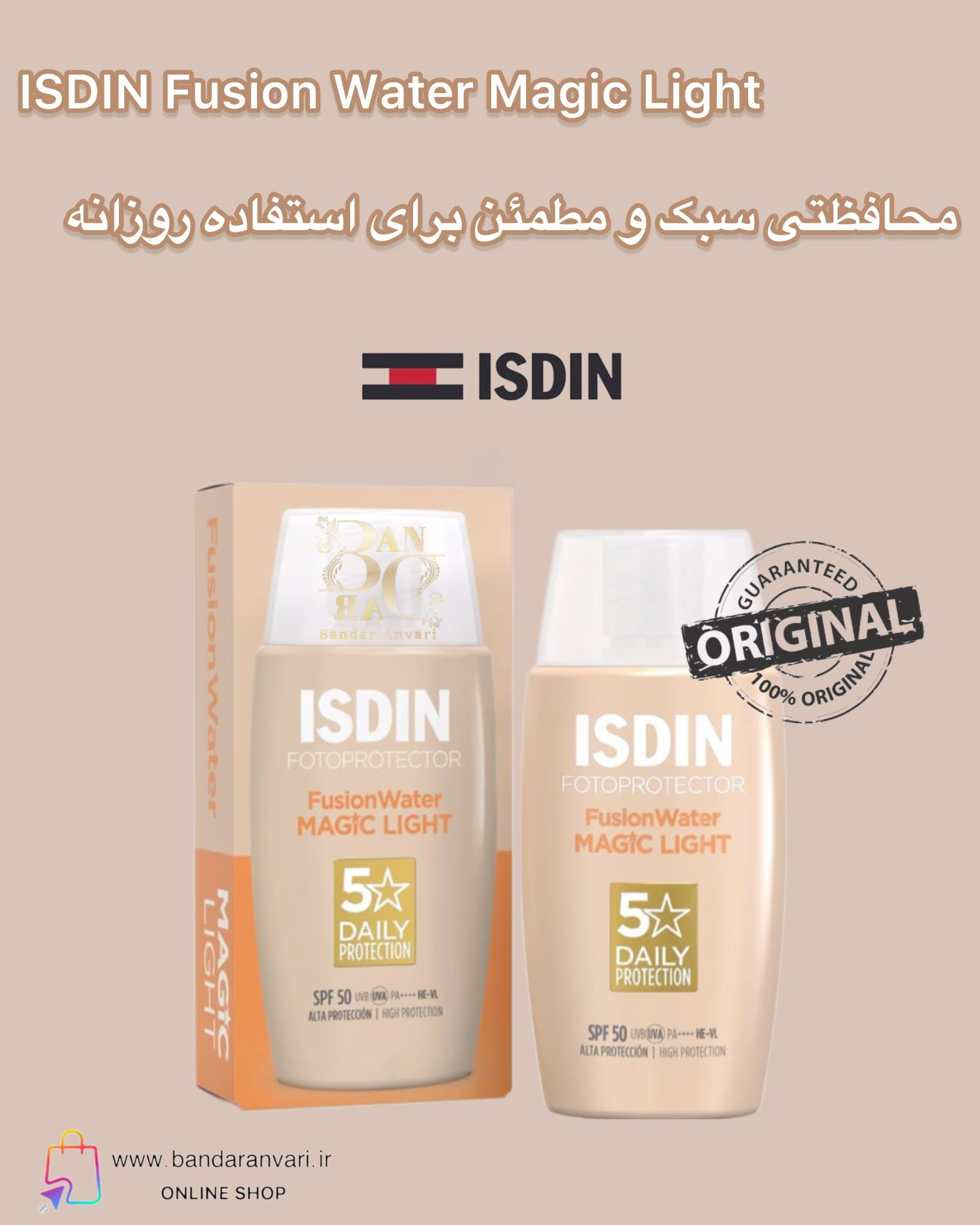 کرم ضدآفتاب Fusion Water Magic Light SPF 50 از برند ایزدین (ISDIN) یک محافظتکننده روزانه با فرمول سبک و با جذب سریع است.