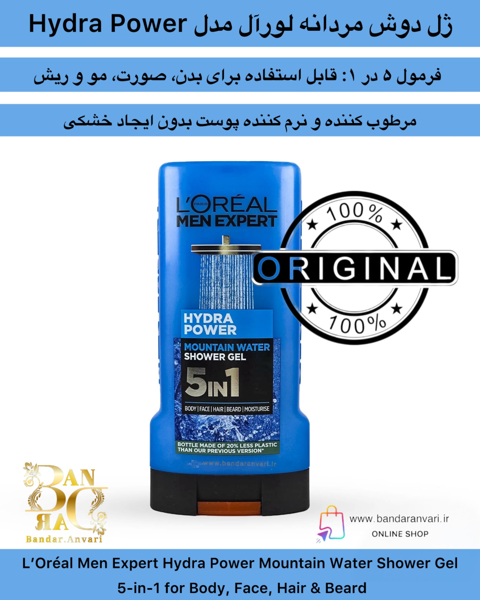 ژل دوش مردانه لورآل مدل Hydra Power – رایحه آب کوهستان، مرطوبکننده و چندکاره L’Oréal Men Expert Hydra Power Mountain Water Shower Gel – 5-in-1 for Body, Face, Hair & Beard