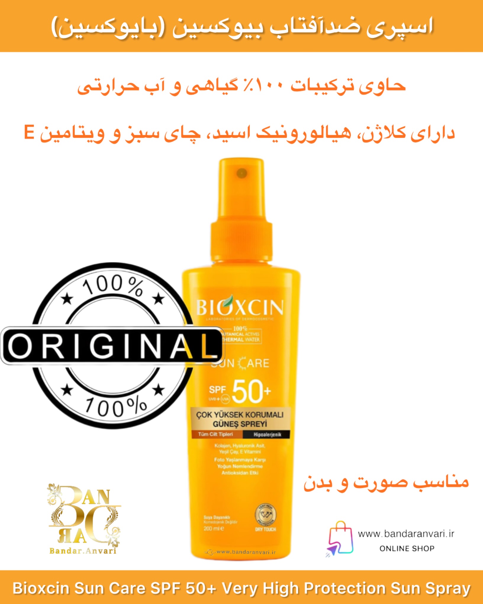 اسپری ضدآفتاب بیوکسین (بایوکسین )SPF 50+ با محافظت بسیار بالا و فرمول گیاهی Bioxcin Sun Care SPF 50+ Very High Protection Sun Spray