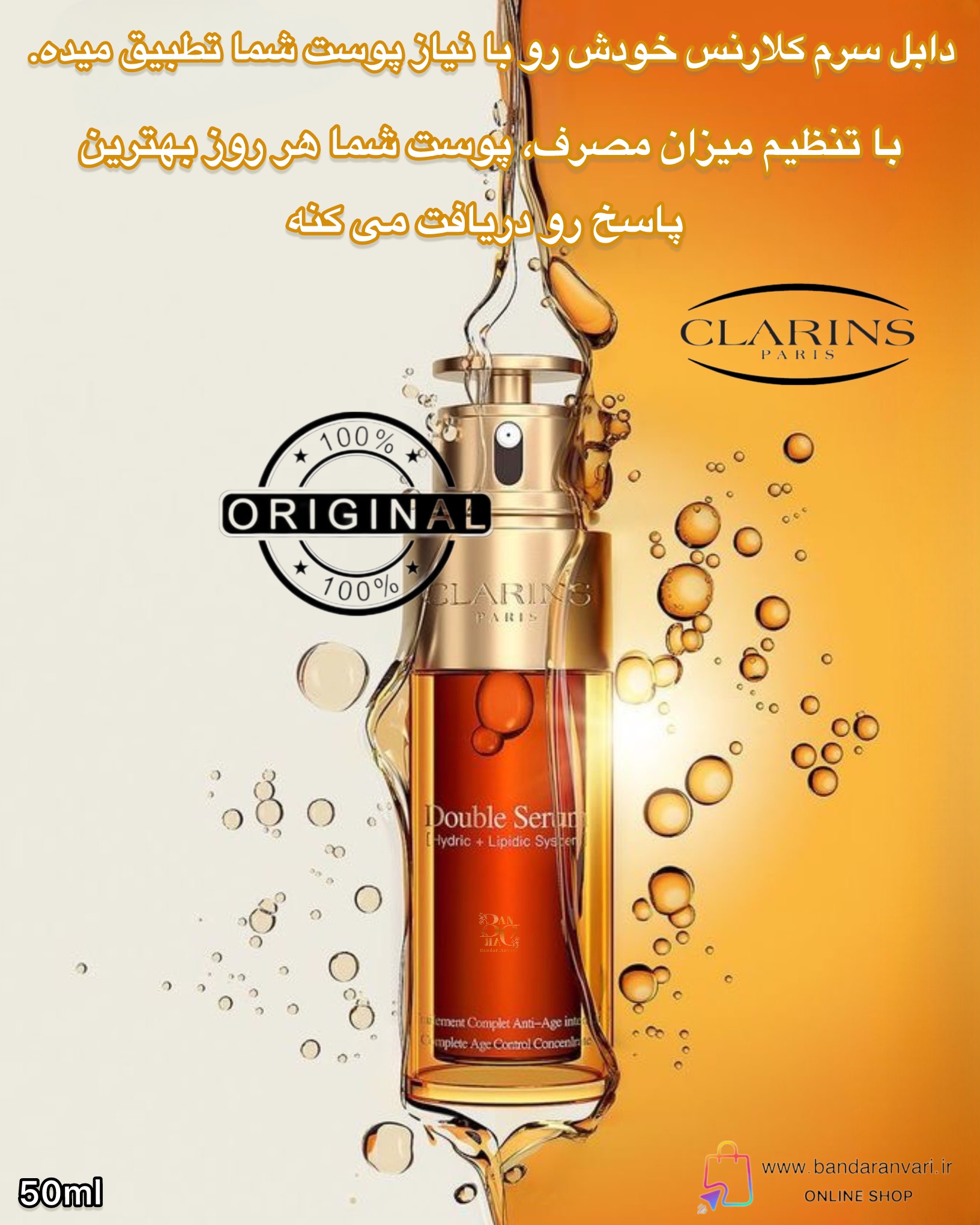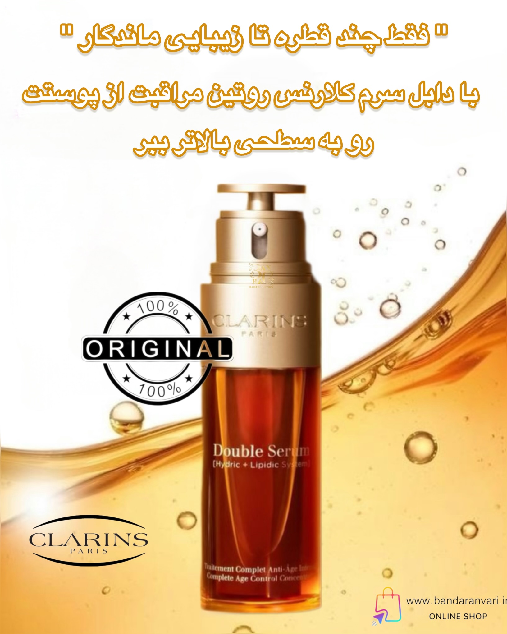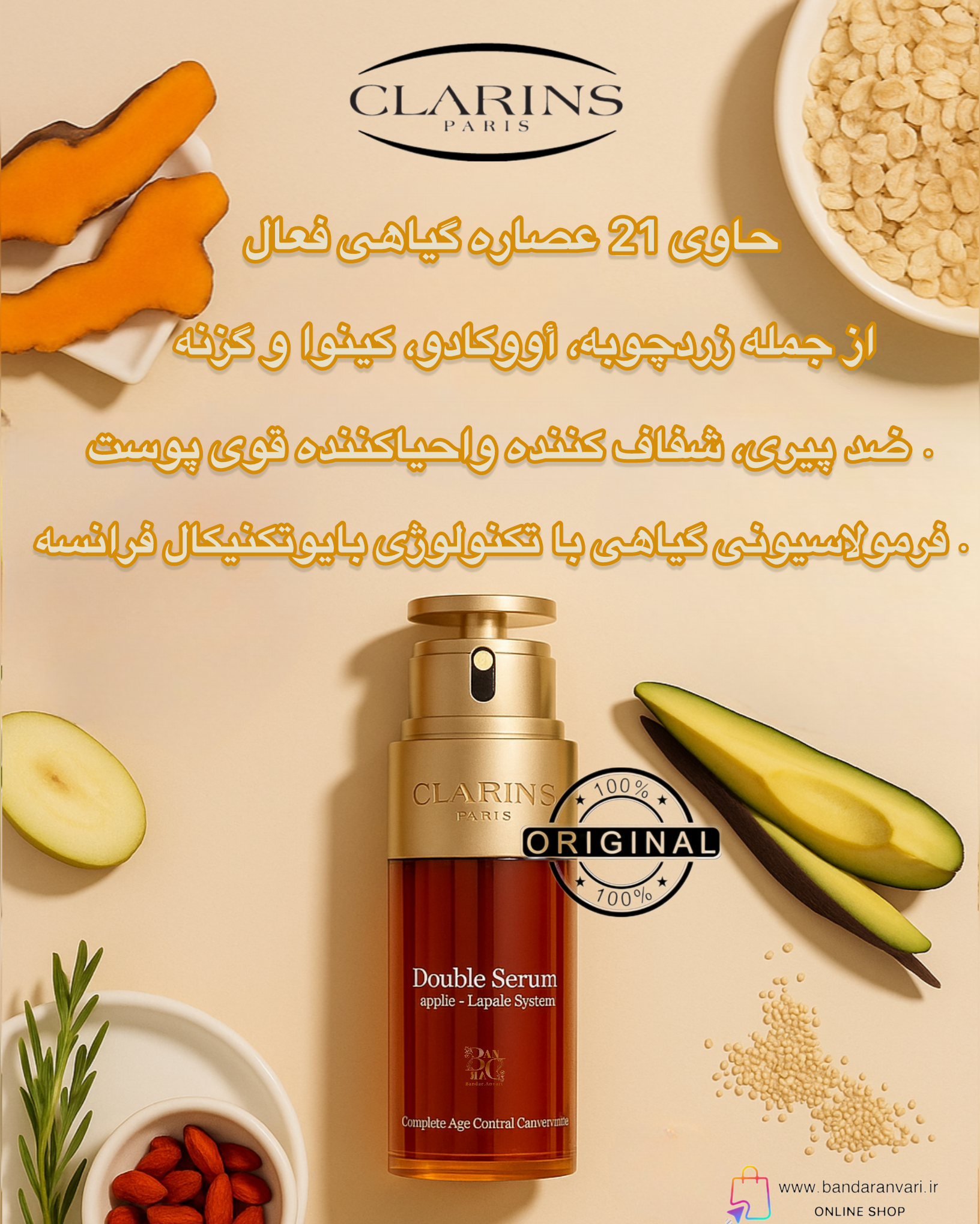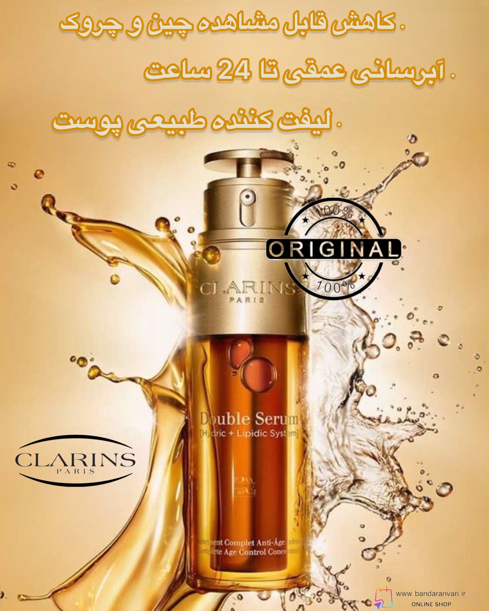 سرم ضدپیری Double Serum از برند فرانسوی کلارنس (Clarins) یک محصول بینظیر و کامل برای مراقبت از پوست بالغ است که با فناوری اختصاصی Hydric + Lipidic System طراحی شده و ترکیبی از فاز آبی (آبرسان) و فاز چرب (مغذی) را به صورت همزمان به پوست میرساند.