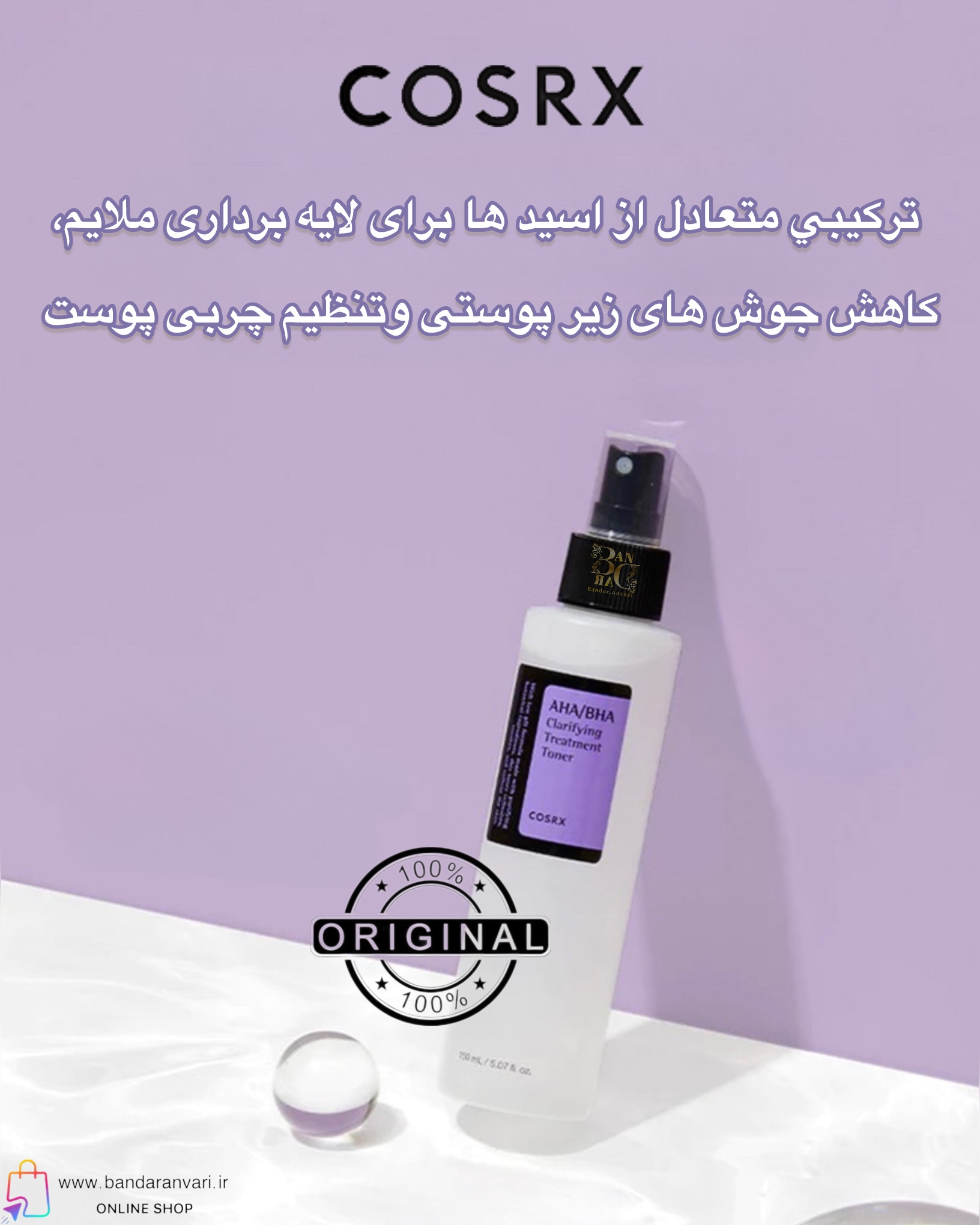 تونر AHA/BHA Clarifying Treatment از برند COSRX یک محصول تخصصی برای لایهبرداری ملایم و تنظیم چربی پوست است که با ترکیب دو نوع اسید موثر AHA (اسیدهای میوهای) و BHA (اسید سالیسیلیک)، به پاکسازی عمقی پوست کمک میکند.