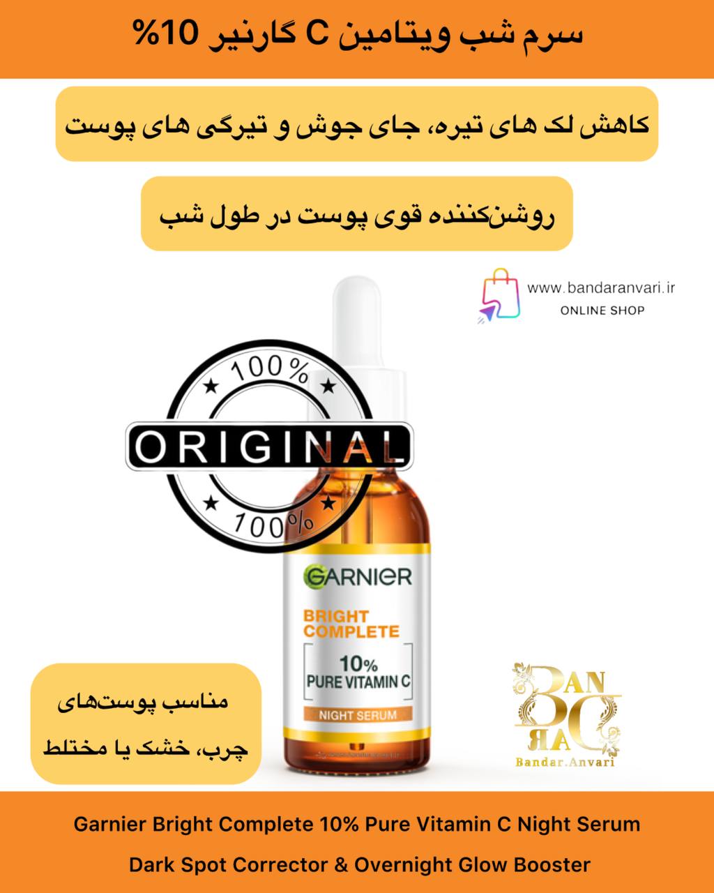 سرم شب ویتامین C گارنیر (Garnier Bright Complete 10% Pure Vitamin C Night Serum) یک درمان مؤثر و تخصصی شبانه برای انواع پوست است که با بهره‌گیری از ۱۰٪ ویتامین C خالص و ترکیبات فعال ضدلک، به کاهش لک‌های تیره، جای جوش و تیرگی‌های پوست کمک می‌کند.
