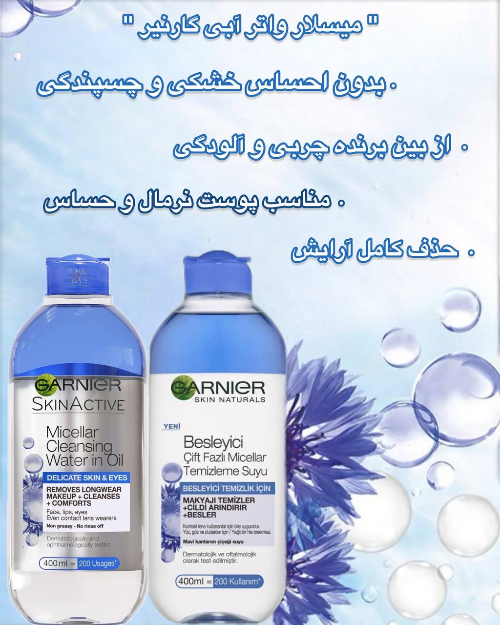 میسلار واتر دو فاز گارنیر، پاککننده قوی آرایش حتی انواع ضدآب، بدون نیاز به آبکشی، مناسب پوست و چشم حساس، بدون چربی و مناسب استفاده روزانه.
