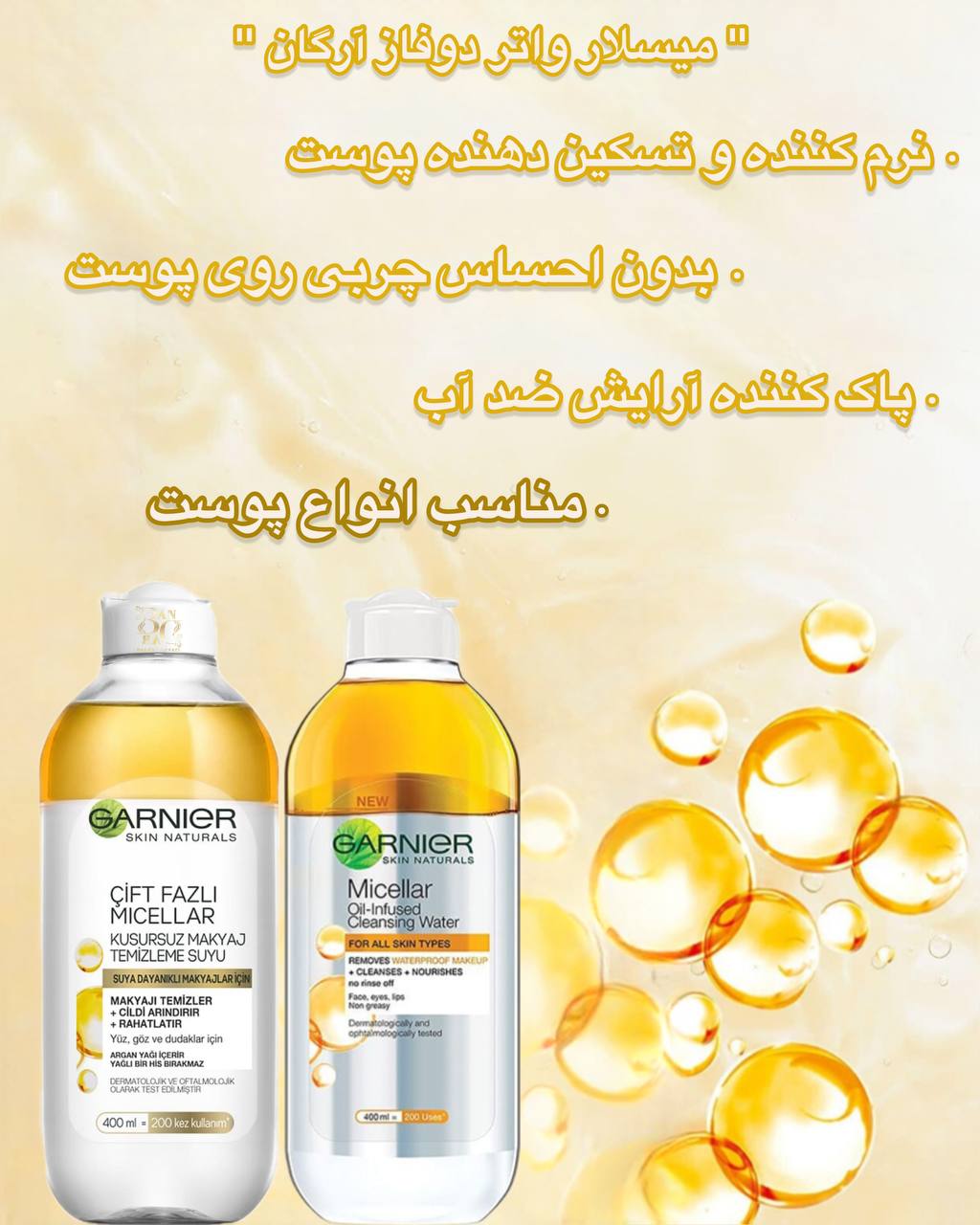 میسلار واتر دو فاز گارنیر با ترکیب روغن، پاک‌کننده قوی آرایش ضدآب، تغذیه‌کننده پوست، بدون نیاز به آبکشی، مناسب انواع پوست.