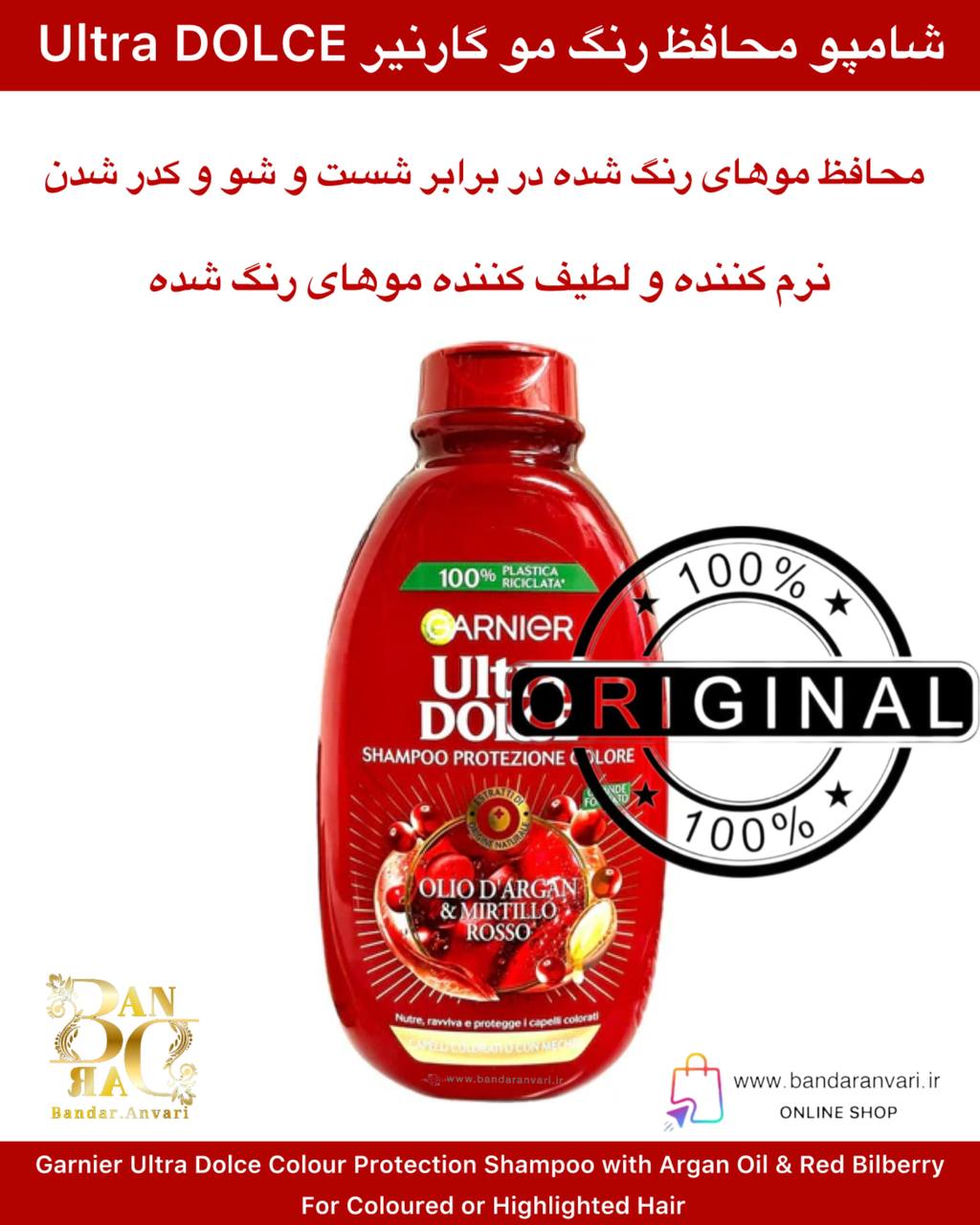 شامپو محافظ رنگ گارنیر اولترا دولچه با روغن آرگان و توت قرمز – مناسب موهای رنگشده و هایلایتشده Garnier Ultra Dolce Colour Protection Shampoo with Argan Oil & Red Bilberry – For Coloured or Highlighted Hair