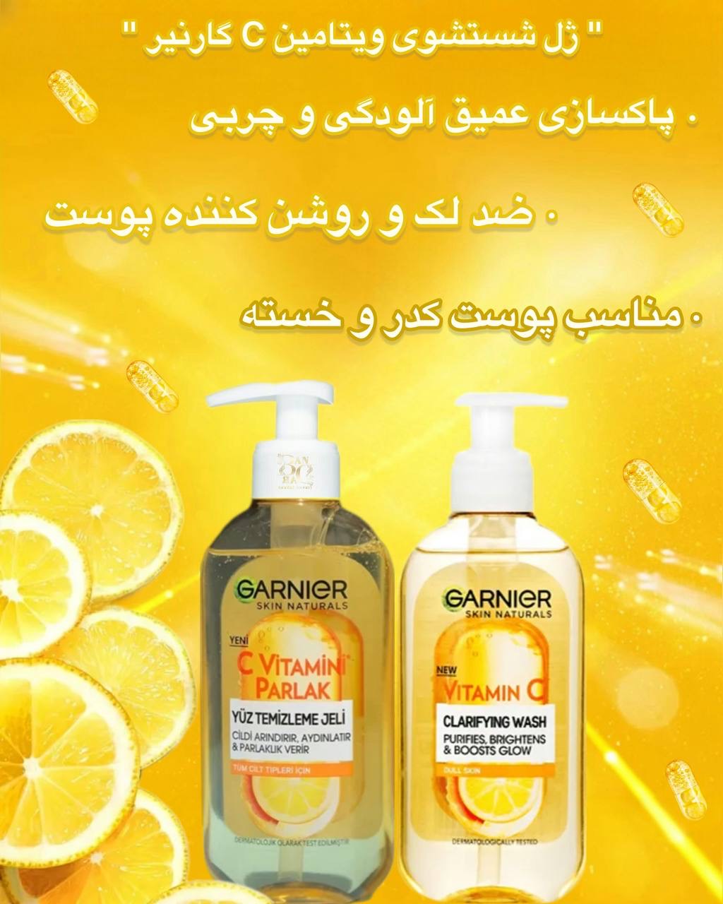 ژل شستوشوی صورت ویتامین C گارنیر، شفافکننده و درخشانکننده پوست، مناسب برای پاکسازی روزانه، کمک به کاهش تیرگی و افزایش طراوت و یکنواختی پوست.