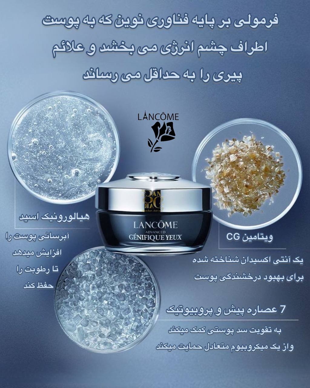 کرم دور چشم لنکوم ادونسد جنفیک با فرمول پیشرفته پروبیوتیکی، تیرگی، پف و چروک دور چشم را کاهش میدهد و ظاهر پوست اطراف چشم را جوانتر، شادابتر و درخشانتر میسازد