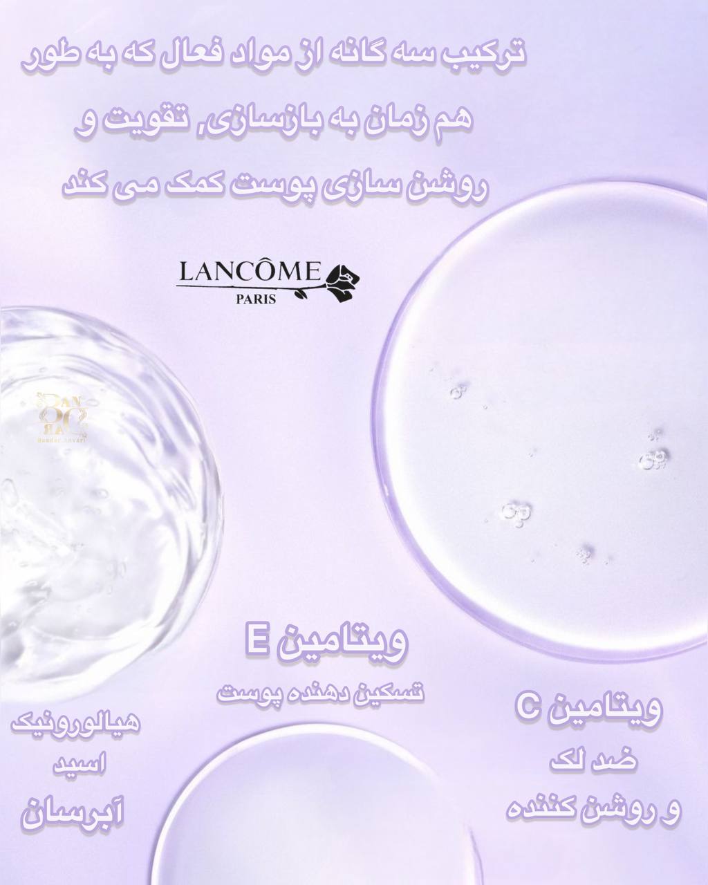 سرم سهگانه رنرژی لنکوم با ترکیب هیالورونیک اسید، ویتامین C و فروس اسید، بهطور همزمان پوست را آبرسانی، روشن، سفت و بازسازی میکند؛ مناسب برای مقابله کامل با علائم پیری