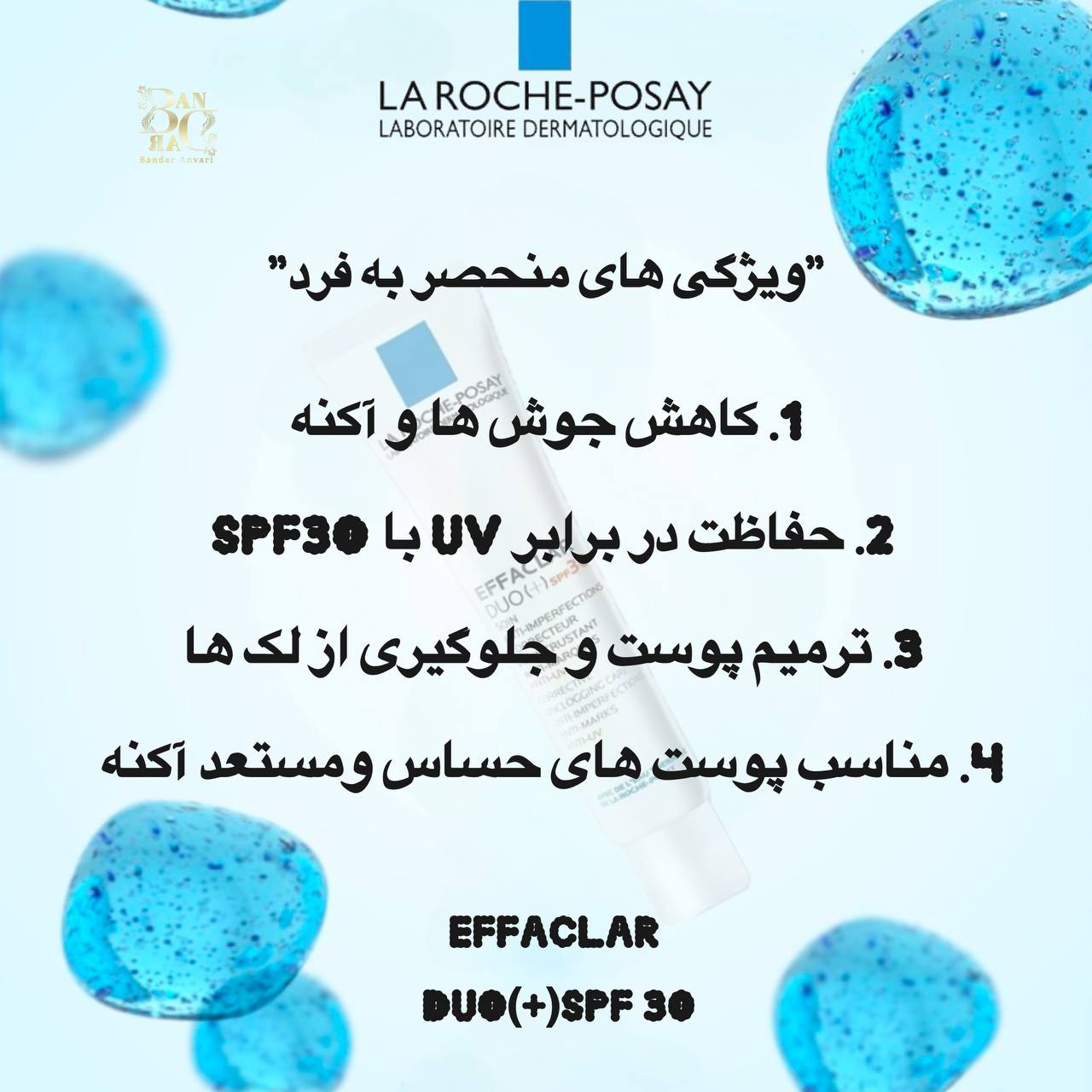 EFFACLAR DUO (+) با خاصیت ضد باکتری، آنتی‌اکسیدانی و ضد التهابی خود، به بازسازی پوست و کاهش جای جوش کمک کرده و باعث کاهش منافذ باز و کنترل چربی می‌شود. این محصول برای پوست‌های چرب و مستعد آکنه مناسب است و بافت سبک و غیر چرب آن به راحتی جذب پوست می‌شود.