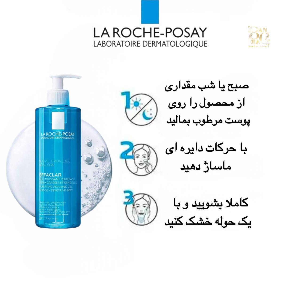 صورت را مرطوب کرده، مقدار کمی از ژل را روی پوست بمالید و بهآرامی ماساژ دهید تا کف کند، سپس با آب ولرم بشویید. از تماس با چشم خودداری شود.