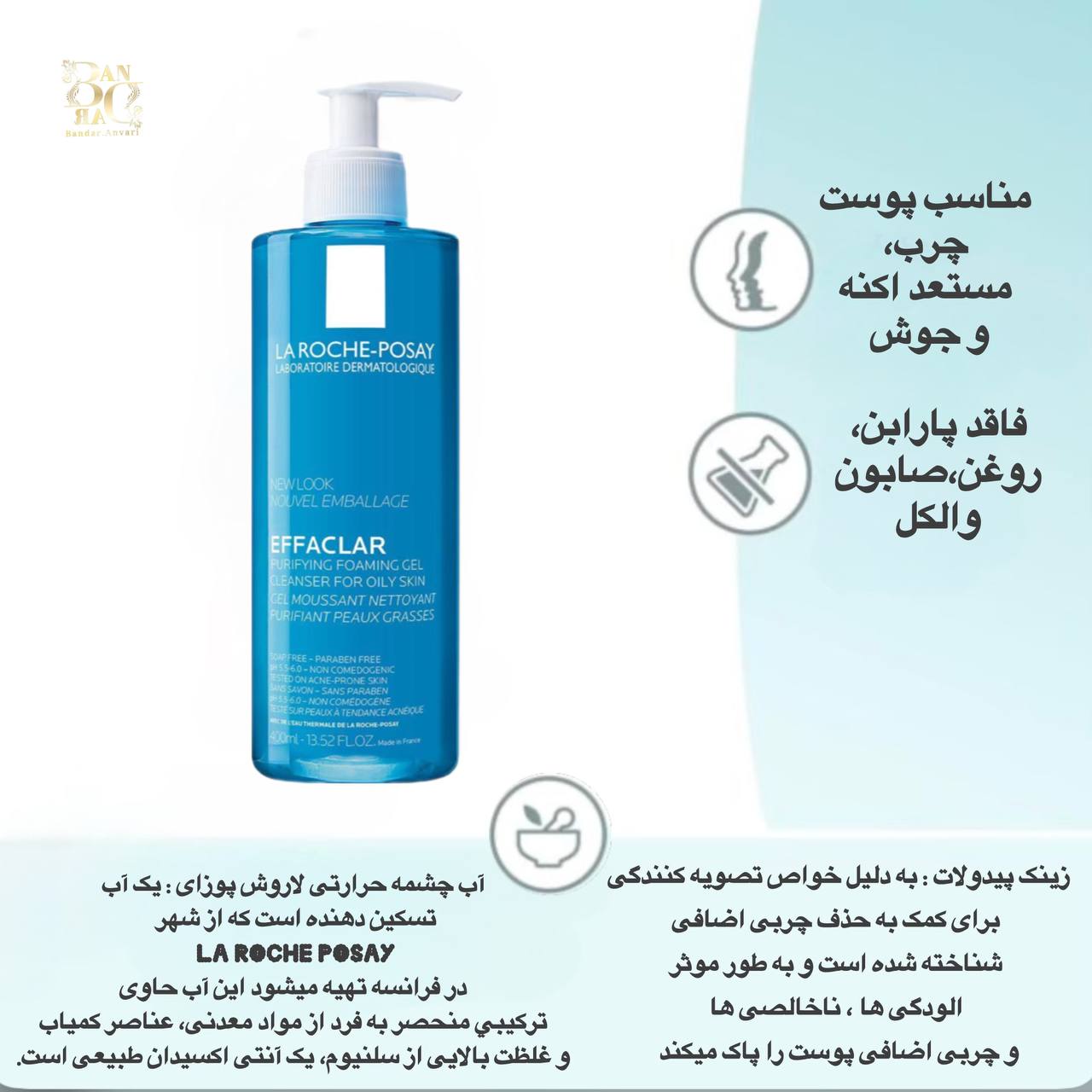 ژل شستشوی صورت EFFACLAR لاروش پوزای؛ پاککننده ملایم پوست چرب و آکنهای، کنترل چربی و بدون صابون، مناسب استفاده روزانه