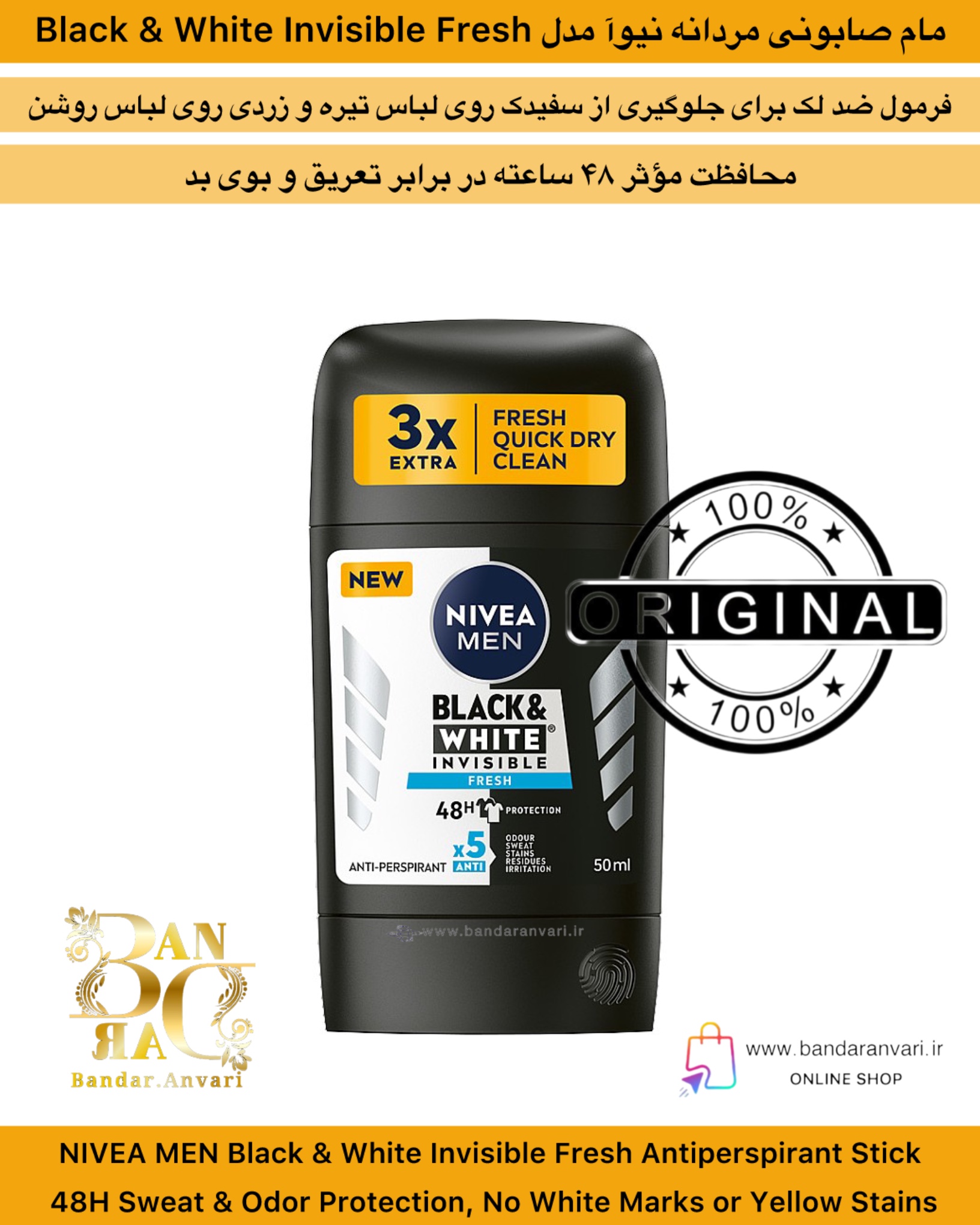 مام صابونی مردانه نیوآ مدل Black & White Invisible Fresh – ضد تعریق ۴۸ ساعته بدون لک روی لباس NIVEA MEN Black & White Invisible Fresh Antiperspirant Stick – 48H Sweat & Odor Protection, No White Marks or Yellow Stains