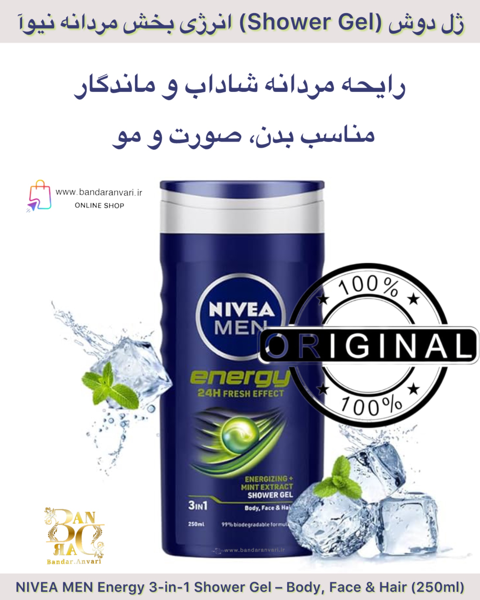 ژل دوش انرژیبخش مردانه نیوآ مدل Energy – مناسب بدن، صورت و مو (۲۵۰ میلیلیتر) NIVEA MEN Energy 3-in-1 Shower Gel – Body, Face & Hair (250ml)