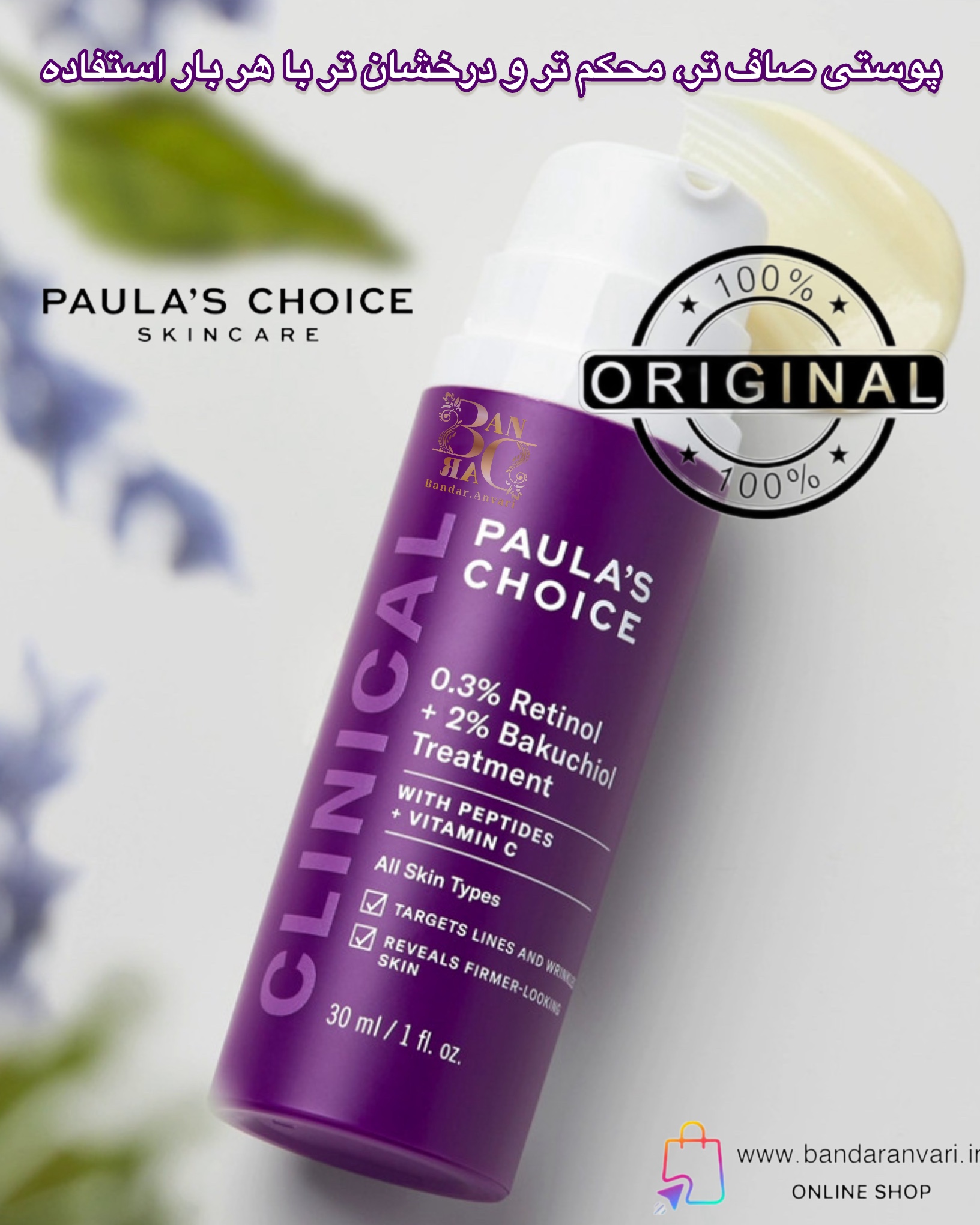 سرم رتینول ۰.۳٪ پائولاز چویس با ترکیب باکوچیول، پپتید و ویتامین C، بدون تحریک پوست را بازسازی، جوان‌سازی و روشن می‌کند – مناسب برای همه انواع پوست حتی حساس‌ترین‌ها.