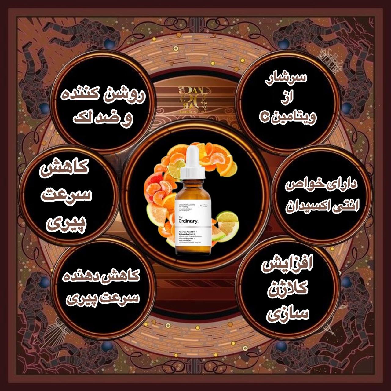 • حاوی 8% ویتامین C خالص (آسکوربیک اسید) با خاصیت آنتیاکسیدانی قوی برای مبارزه با رادیکالهای آزاد و کاهش علائم پیری