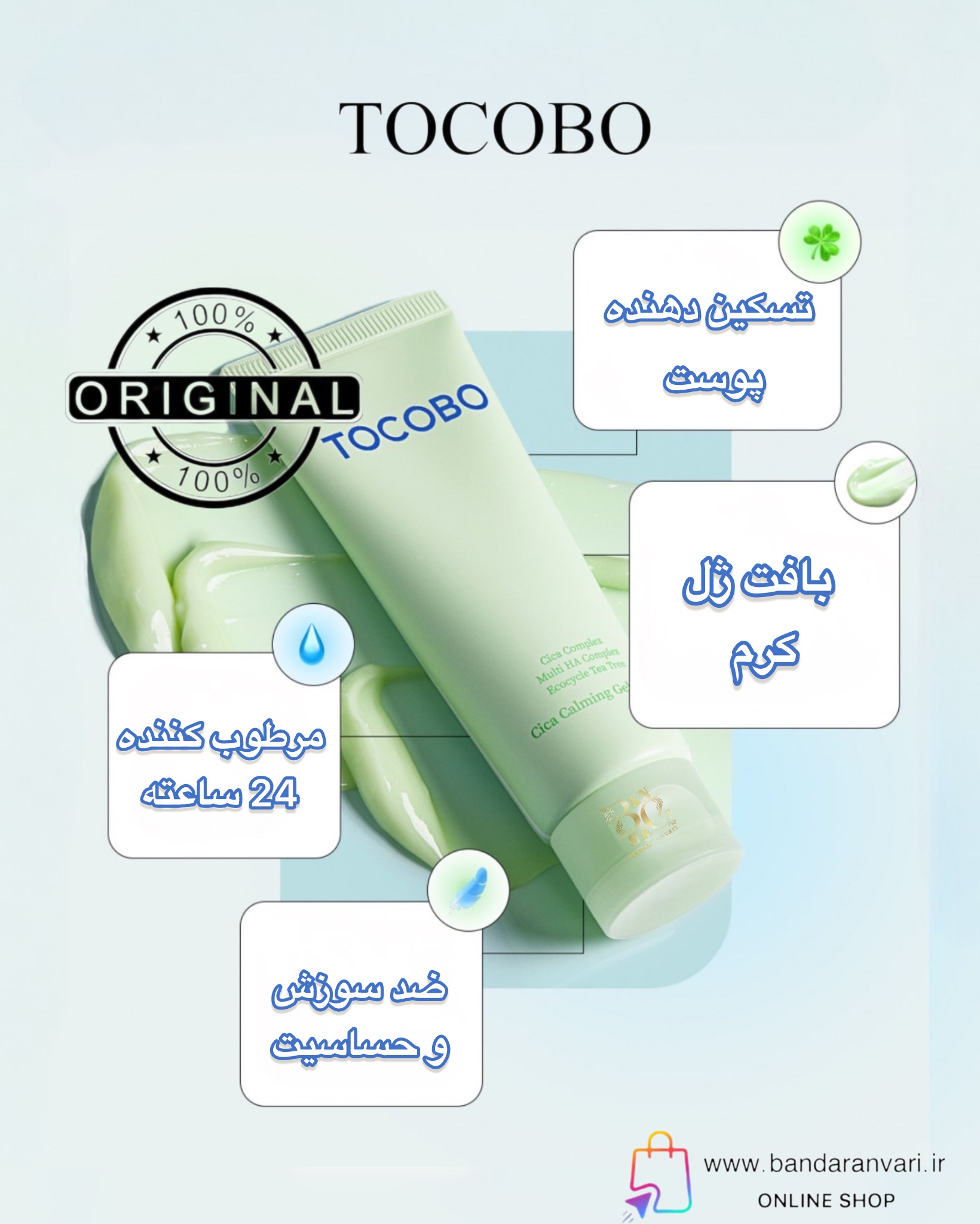 ژل کرم آرامبخش توکوبو (TOCOBO Gica Calming Gel Cream) یک محصول سبک و مرطوبکننده با فرمولاسیونی ویژه برای پوستهای حساس، چرب و مستعد آکنه است. این کرم با ترکیبی قدرتمند از Cica Complex (عصاره سنتلا آسیاتیکا)، Multi Hyaluronic Acid Complex (ترکیب چندگانه هیالورونیک اسید) و Ecocycle Tea Tree (روغن طبیعی درخت چای با خاصیت ضدباکتری و تسکیندهنده) طراحی شده است.