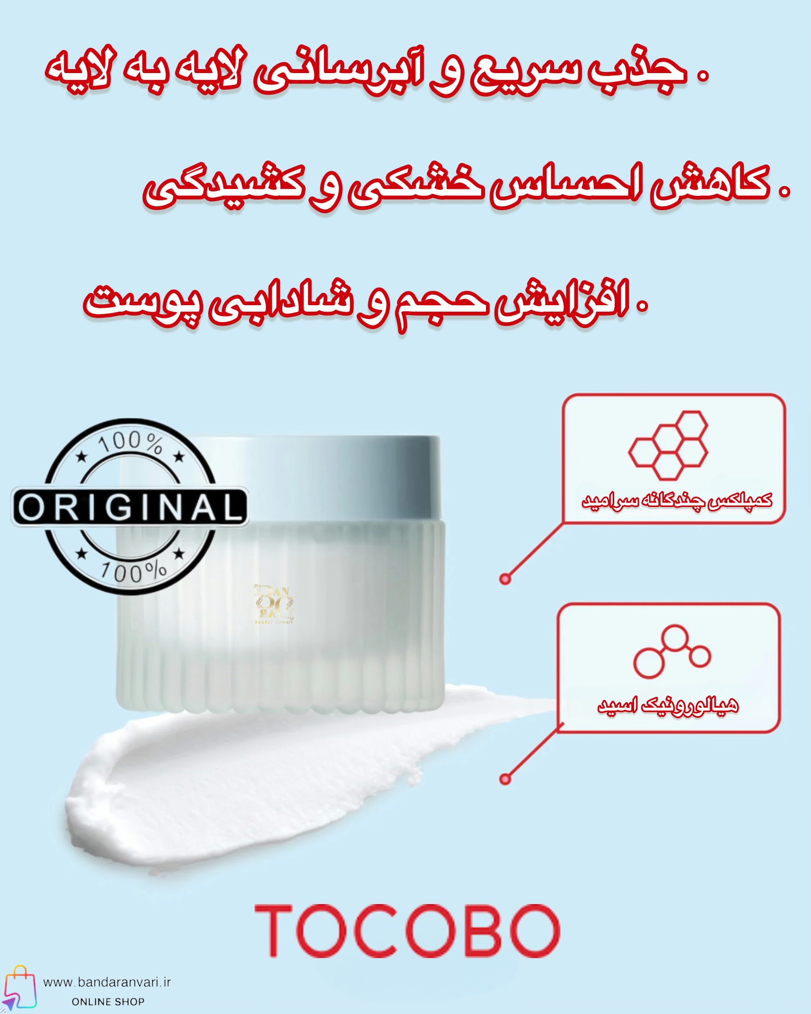 کرم مرطوبکننده توکوبو با ۱۰٪ هیالورونیک اسید و سرامید، رطوبت عمقی را تأمین کرده و سد دفاعی پوست را تقویت میکند؛ مناسب برای انواع پوست حتی حساس و خشک.